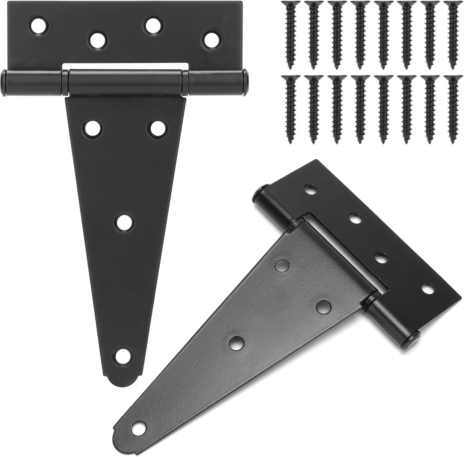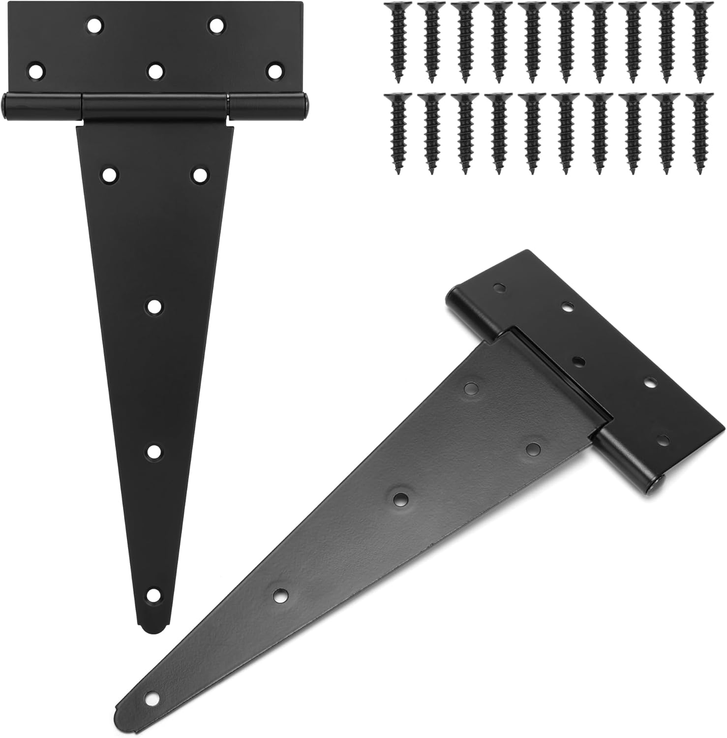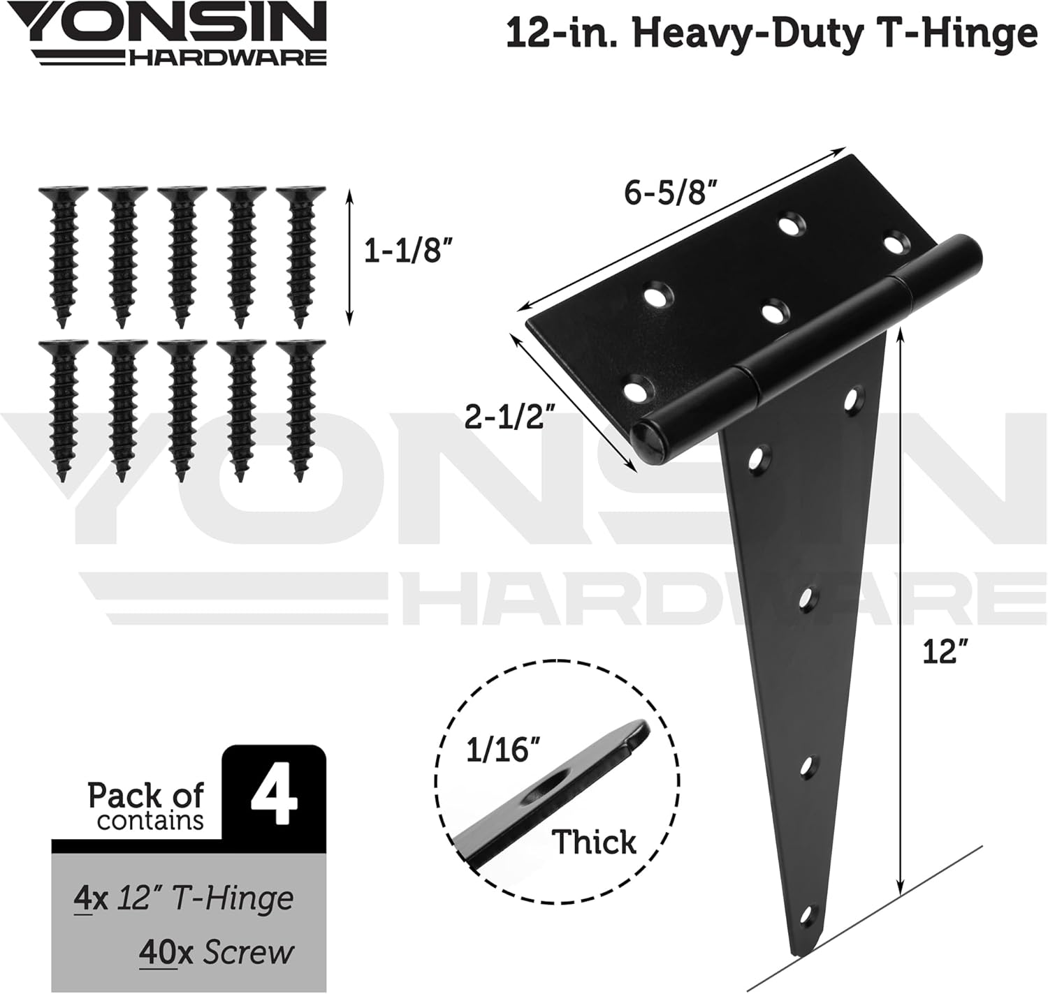 YONSIN T-strap hinges heavy duty gate hinges door hinges black door hinge strap hinge shed door hinges, 12 Inch, Wrought Hardware Rustproof, 4PCS Features: YONSIN T-Strap black shed door hinges with countersink holes for extra strength and to prevent wood from splitting. YONSIN T-Strap heavy duty door hinges is made of quality material with surface galvanization, strong, firmly, rustproof, durable and not easy to bent. Widely used for all kinds of indoor and outdoor buildings, such as shed door, playhouse, gate, yard door, garden door, wooden vinyl fence, storage barns sheds and more. Product Specifications: Color: Black Material: Wrought; Dimension: 6-11/16 inchx2-7/16 inchx12 inch Hole Diameter:5/16 inch Thickness:1/8 inch Package Content: 4x 12 inch T-Strap Hinges 40x mounting screws