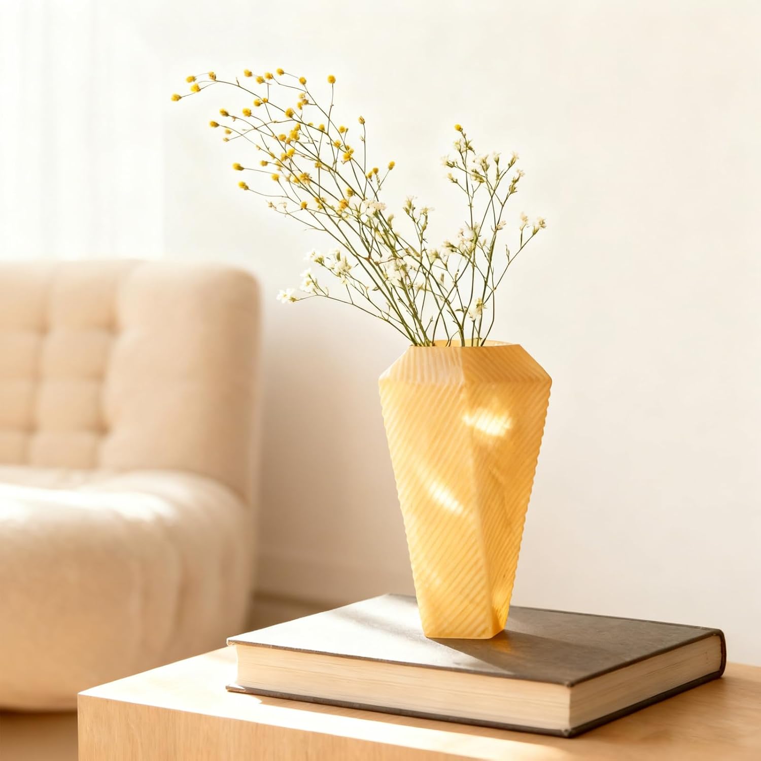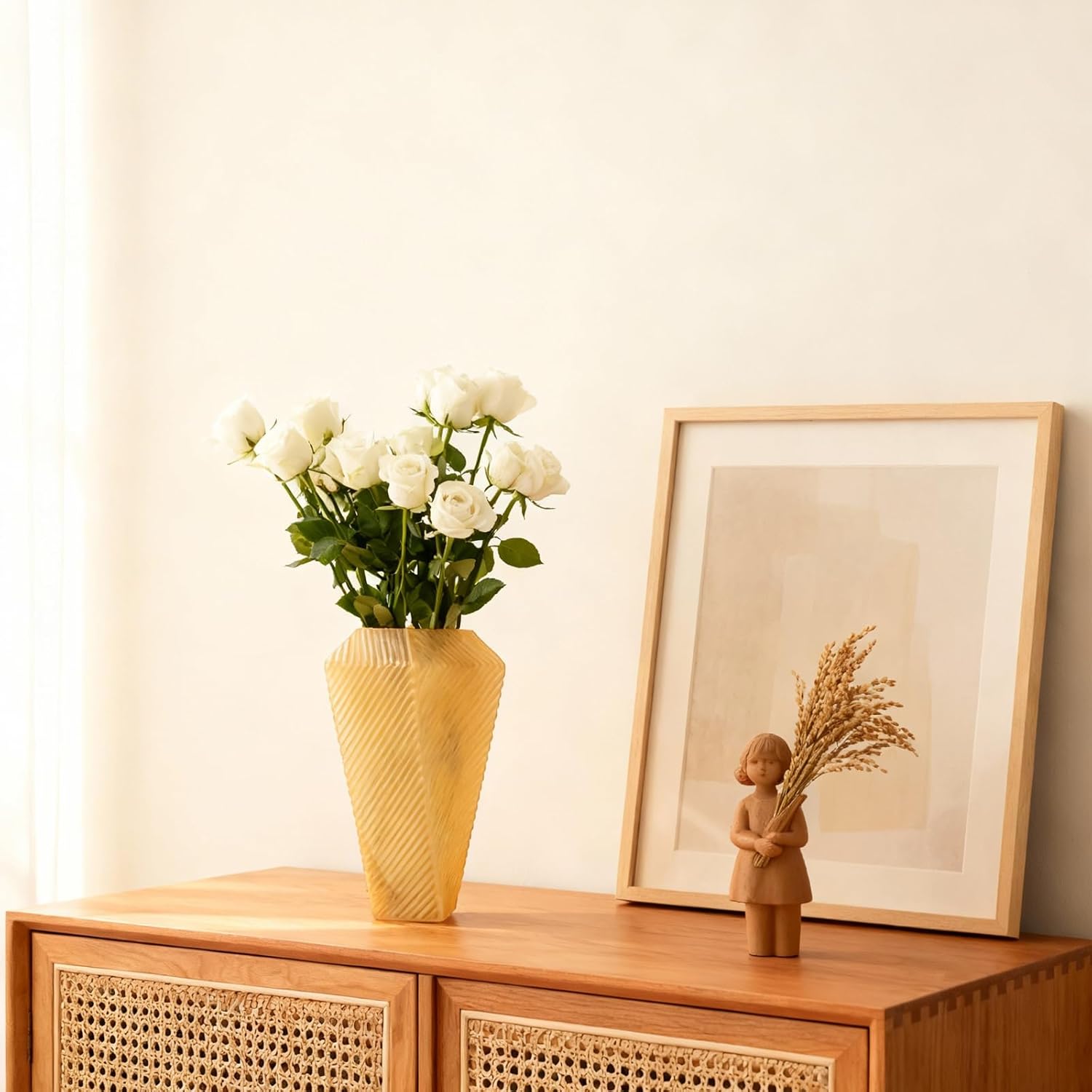 Add warm, modern character to your home with this textured amber glass vase in a semi-transparent amber/brown tone. It’s an easy piece of amber decor for modern, minimalist, and boho interiors, and it complements the cozy glow shoppers love in brown glass vases, brown glass vase, and amber glass vases home decor.Designed to hold water, it works as an amber flower vase for fresh bouquets and as a vase brown accent for pampas grass, dried florals, or seasonal branches. Style it on a living room shelf, or use it as brown vases for centerpieces—it also fits the warm tablescape trend of amber glass vases for centerpieces for dinners and weddings. The color reads like amber colored vases with a hint of vintage warmth, similar to amber vintage vases and dark amber glass vases, but in a cleaner modern shape.Quick answers (Rufus-style):Can it hold water? Yes, it’s watertight for fresh flowers.What flowers look best? White/neutral blooms, greenery, or dried pampas look especially good with a brown vase.Can it hold tall flowers? Yes; for very tall stems, trim and balance the arrangement for best stability.Is it dishwasher safe? Hand wash recommended to protect the finish and texture.Does it come with flowers? No—vase only.Is it good for gifting? A tasteful modern vase gift for housewarmings and home refreshes.