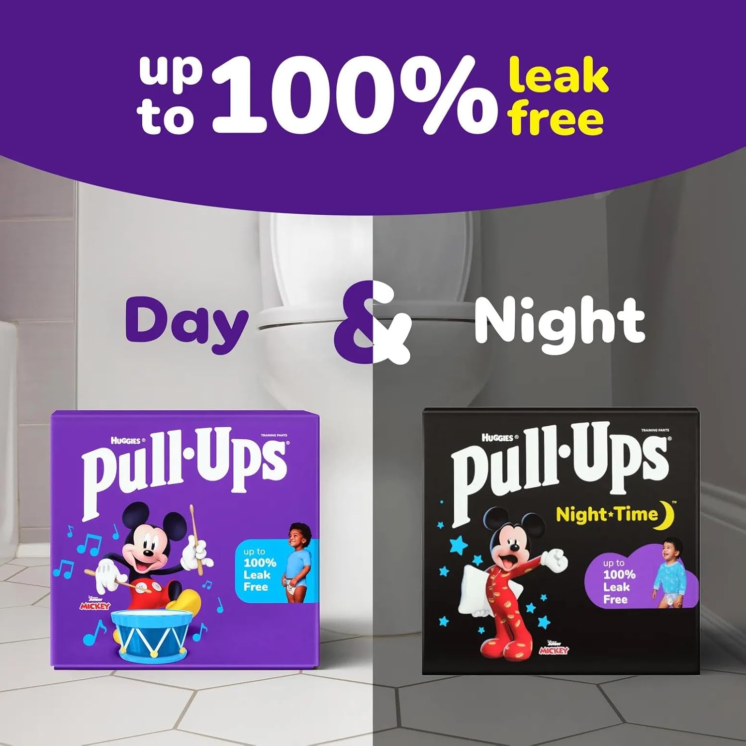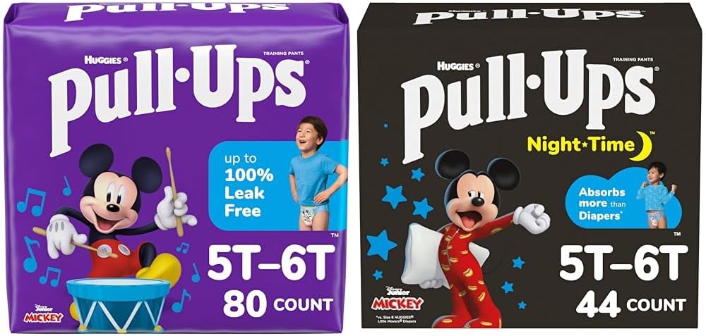 The Pull-Ups Day and Night Bundle for Girls provides potty training protection both day and night. Our bundle includes 99 Pull-Ups Training Pants for Boys (Size 4T-5T) and 52 Pull-Ups Nighttime Potty Training Pants for Girls (Size 4T-5T). Perform easy changes with the refastenable sides of Pull-Ups for Boys and Pull-Ups Nighttime for Boys potty training underwear, on the go or during the night. Both Pull-Ups and Pull-Ups Nighttime for Boys training underwear offer targeted absorbency where girls need it most. Both our daytime and nighttime potty training underwear are made with soft and breathable materials for comfortable wear. Get up to 100% leak-free protection with both Pull-Ups for Boys and Pull-Ups for Boys Nighttime, as well as up to 12 hours of overnight protection where girls need it most with Pull-Ups for Boys Nighttime.