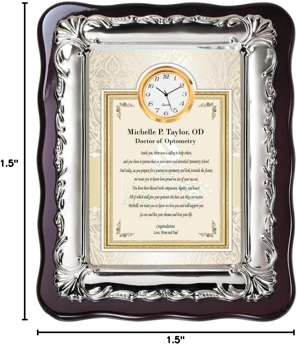 Personalized Congratulations Optometry School Graduation Poetry Clock Frame Gift for Optometrist Doctor of Optometry. A unique Optometrist gift for him or her Optometry professional and thoughtful clock gift idea for wife, husband, son, daughter etc.. We are your source for personalized student graduation gifts ideas to Optometrist professionals on graduation day. Show your gratitude and appreciation to your Optometrist Optician Optometrist Ophthalmologist Doctor of Optometry OD with a beautiful and unique congratulations Optometry school graduation poem present clock or frame. Commemorate and appreciate the new college university graduate with a thoughtful school congratulation poem. A special milestone moment on daughter, son, friend, father or mother Optometry school graduation day deserves recognition for their sacrifice that made you the person you are today. Show your love by giving the new student graduate valuable sentimental timeless personalized poetry gift. Shop for engrave inspirational and beautiful Optometry school graduation gift presents which are unique, poetic and heartwarming. Item FR20 Optometrist