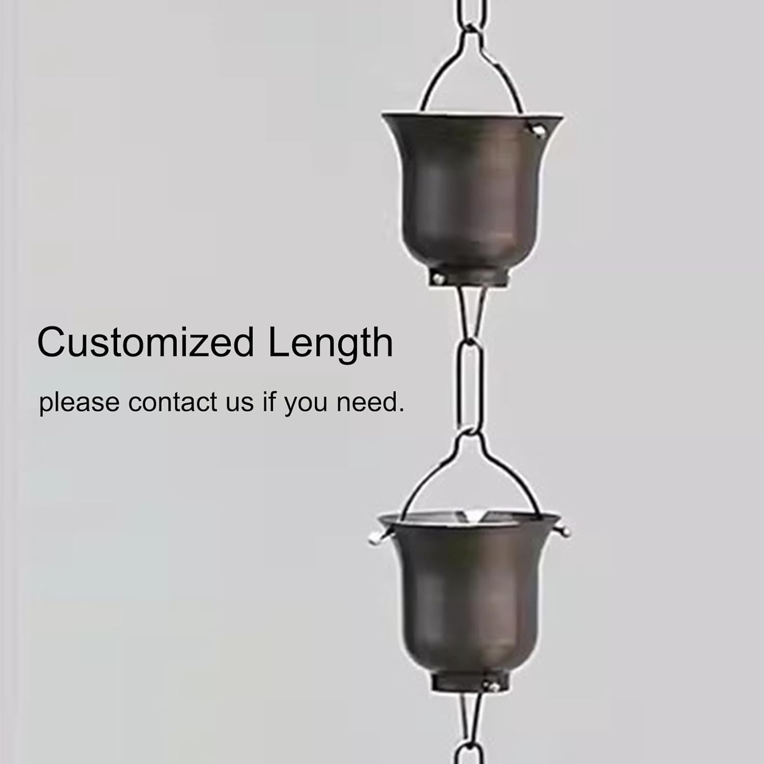 This rain chain directs rainwater from the roof to the ground and is both functional and aesthetically pleasing. Specification Material: purple copper Cup Size: width x height Length: can be customized Cup Numbers: can be customized Features Sturdy and durable. Adjustable rain chain length. Both functional and decorative. For long-time outdoor use. Simple and quick installation. Can effectively direct the flow of rainwater. Cautions Please clean the gutter before installation. There may be an error of due to manual measurement. Due to light problems, there will be a small color difference, subject to the real thing. Each cup of the outdoor rain chain is designed with a wide upper and a lower narrow, effectively capturing most of the rainwater, but some splashes will occur.
