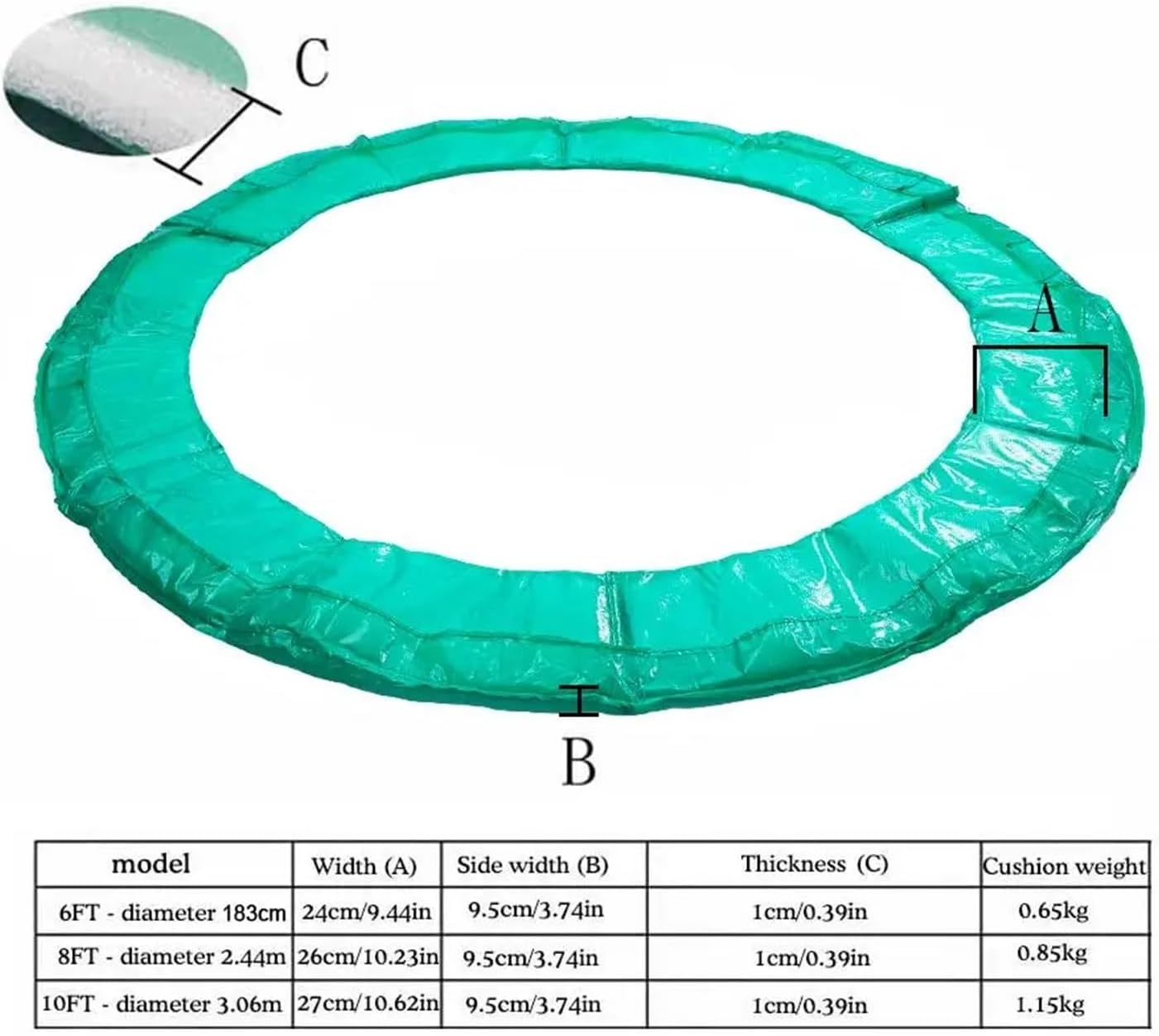 SpecificationName: trampoline protection matColor: green, blueMaterial: PEPackage List.1* Trampoline protective matEncourages Active Play: With the Safety Trampoline Pad Replacement, kids can enjoy hours of bouncing while parents have peace of mind about safetyFits Most Round Trampolines: The Universal Trampoline Replacement Safety Pad is designed to work with a variety of trampoline sizes, making it a versatile choice for households